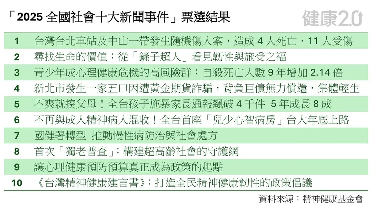 精神健康基金會舉辦「2025全國社會十大新聞事件」票選結果記者會,公布與精神健康高度相關的年度重大事件。從台北車站與中山商圈的隨機傷人案、青少年自殺率持續攀升,到家庭因詐騙走向集體輕生,以及未成年人對父母施暴案件激增,這些事件不僅震撼社會,也共同指向台灣正在累積的深層心理與結構性危機。