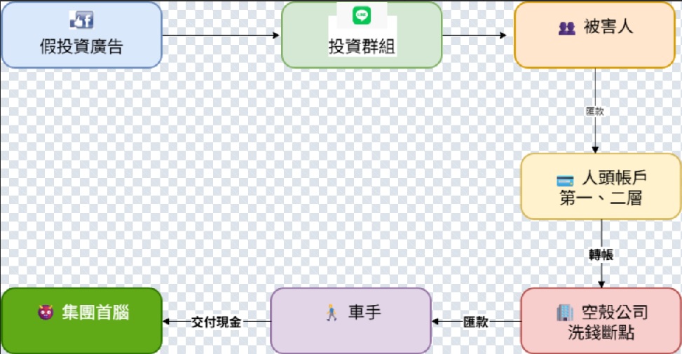 刑事局南部詐欺偵查中心調查發現,詐騙集團利用網路上廣告,誘使被害人點進去後,以為是「真」不敗教主陳重銘在線上跟人聊天,並請助理幫忙申購股票,被害人因而落入「假投資」詐騙陷阱,刑事局偵八大隊第六隊鄭世興隊長說,「經統計共有包括徐姓等39名被害人受騙上當。該詐欺集團分工細膩,由主嫌張○○(水房首腦)與夏○○(收簿首腦)等人為首,透過虛設「匯通寶購物公司」、「麗大國際事業股份有限公司」、「恆富勤資產公司」等空頭公司作為洗錢中繼站;被害人將款項匯入第一層人頭帳戶後,集團成員即透過網路轉帳,將贓款層層轉匯至第二、第三層之空頭公司帳戶,最後再由周姓嫌犯等第四層車手前往提領,製造金流斷點以規避查緝。」