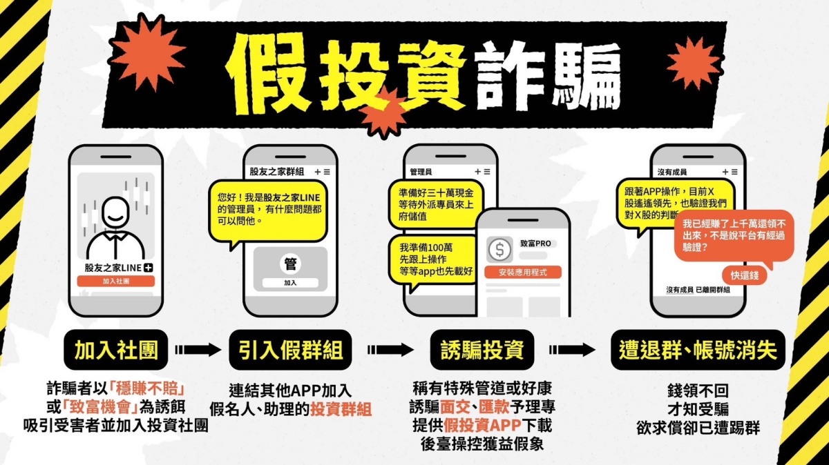 詐騙案件層出不窮,詐騙集團手法也是推陳出新,讓民眾防不勝防,而隨著科技網路的發展,各種貼近民眾日常生活的詐欺、網路犯罪樣態百出,近年來投資詐騙案件持續攀升,成為所有詐騙類型中財損金額最高的一種。詐騙集團利用民眾想快速獲利的心理,設計出層層包裝的投資陷阱,讓人防不勝防。常見的投資詐騙手法~「假投資平台」。詐騙者會透過社群媒體或通訊軟體,主動加好友,假冒投資專家或分析師,推薦股票、虛擬貨幣或外匯投資,並引導加入假的投資APP或網站。