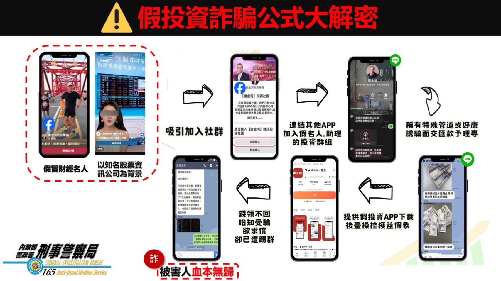 這款常見的詐騙廣告是盜用知名股票分析公司背景,以素人AI影像假冒財經專家,引導民眾加入封閉式社群媒體,例如LINE或Telegram,再誘使被害人加入詐騙投資平臺。刑事局提醒,投資管理為特許業務,未經合法立案的股票公司提供投資秘笈和理財APP,都不可輕易相信。若民眾有投資理財需求,請務必到正規的證券公司現場辦理,並由在該機構上班的專員親自服務、安裝正確軟體,避免遭受詐騙。
