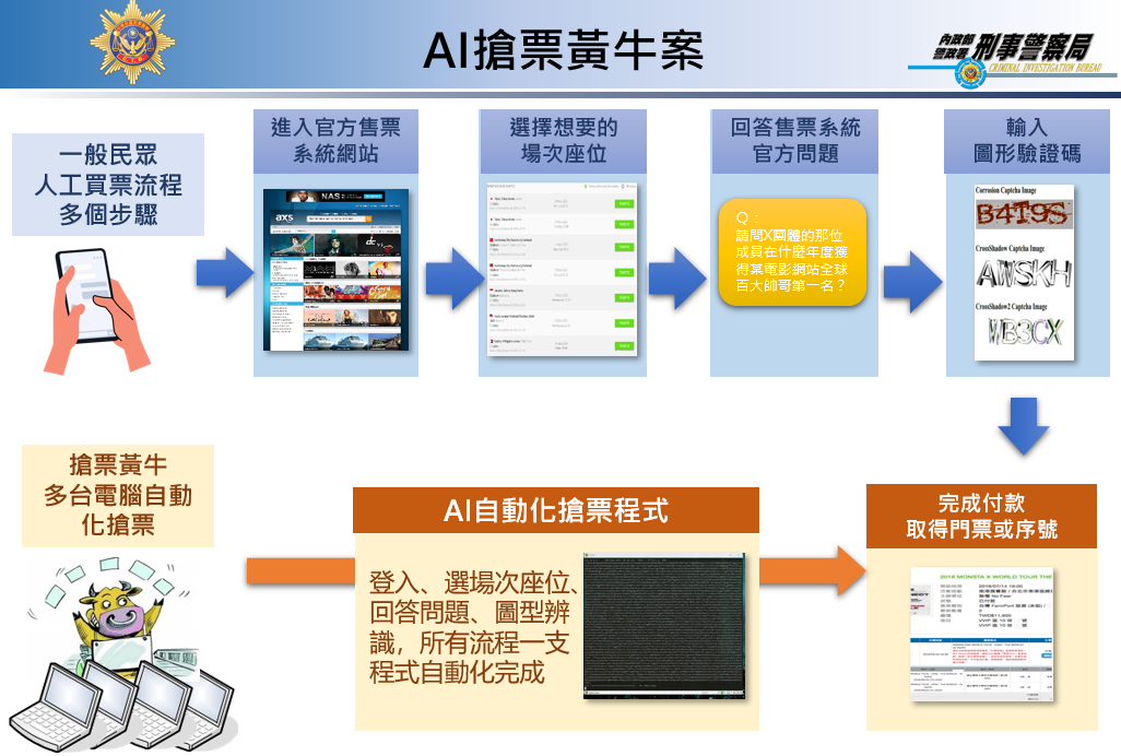 刑事局偵破全國首件搶票黃牛案,周姓犯嫌成立搶票工作室,以多種AI自動化程式,代客搶購熱門演唱會等門票,只需4秒鐘就能購得一張票券,每張票加收1、2千元代購費,短短3個月內獲利近新臺幣28萬元。