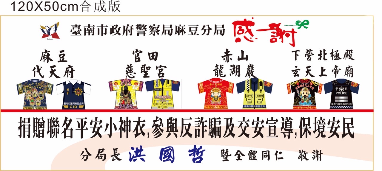 麻豆分局運用各廟宇的代表特色共同推出象徵平安與守護的「平安小神衣」,將神祇保境安民的民俗信仰融入警政治安與交通安全宣導。