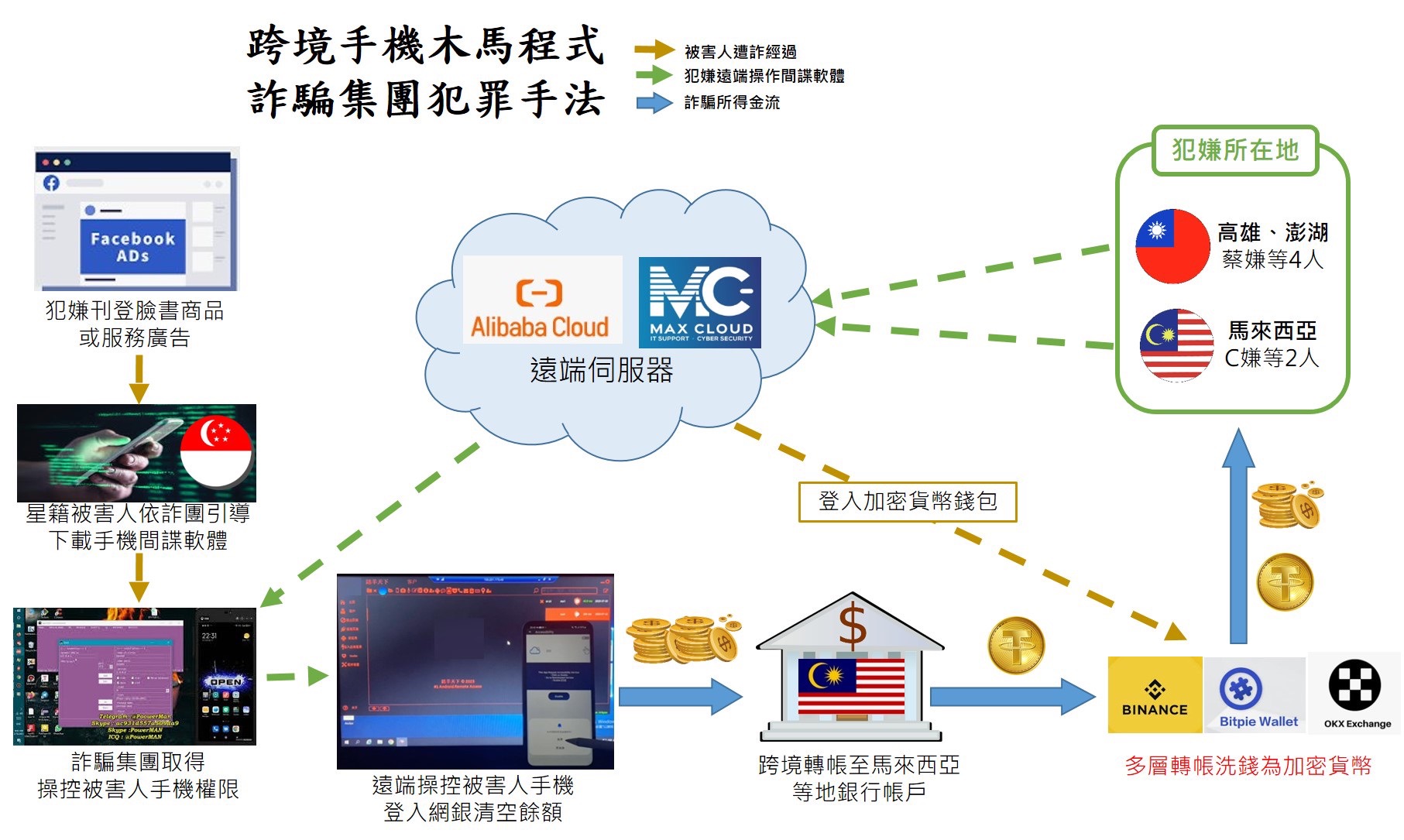新加坡警方接獲多起被害人報案遭詐騙,有不明犯嫌透過臉書廣告,誘騙不特定新加坡被害人手機下載含有木馬程式之軟體,其中主要IP位置來自於台灣、馬來西亞,因此通知臺、馬2國協助調查。國際刑警科科長李昆達表示,嫌犯將木馬植入APP軟體,等被害人下載之後就可以窺探手機,並取得銀行帳戶密碼進而將錢轉走,爾後再以虛擬貨幣分贓。初步估計被害人達1899人,被害金額達新臺幣7億8430萬元,約新加坡幣3410萬元,刑事局刑警科已逮捕蔡姓等4名嫌犯到案。