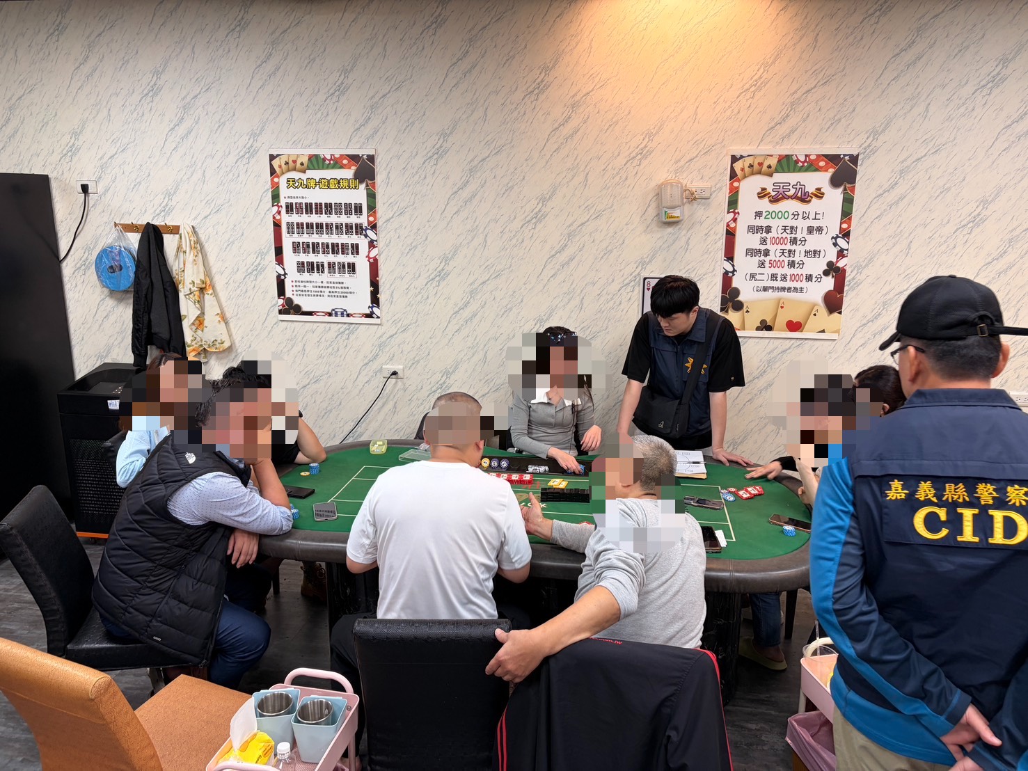 嘉義縣警察局接獲民眾檢舉,朴子市某桌遊館涉嫌以桌遊名義掩護賭博行為,經蒐證完備後持搜索票前往查緝,嘉義縣警察局刑事警察大隊蘇俊冠副隊長說:當場查獲負責人、會計及現場工作人員等犯嫌7名、賭客13名,並查扣現金10萬600元、籌碼93萬30分等賭資及撲克牌2副、天九牌1副、骰⼦61顆、計時器1臺、點鈔機2臺及監視器主機3臺、對講機等證物,全案依刑法賭博罪嫌移送偵辦。警方呼籲業者切勿心存僥倖,勿以合法營業掩護違法行為,以免觸法。