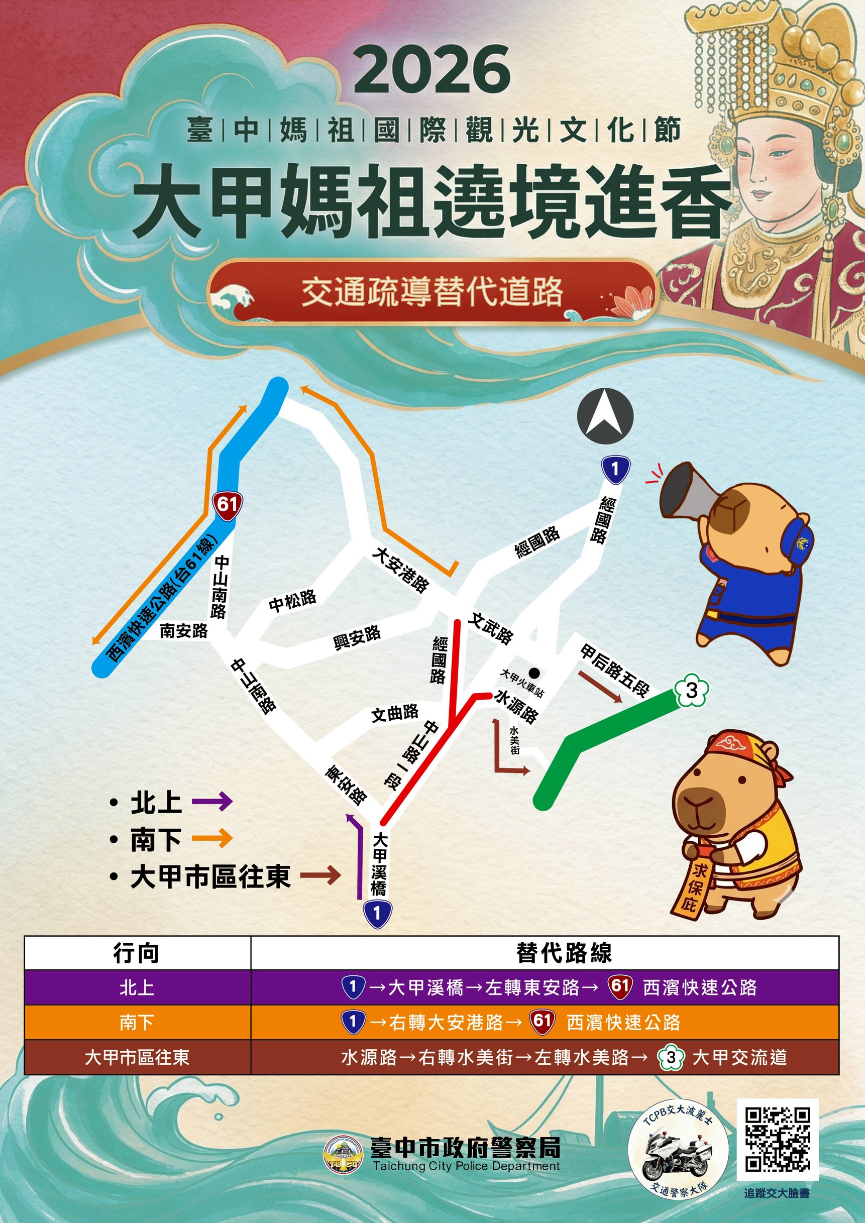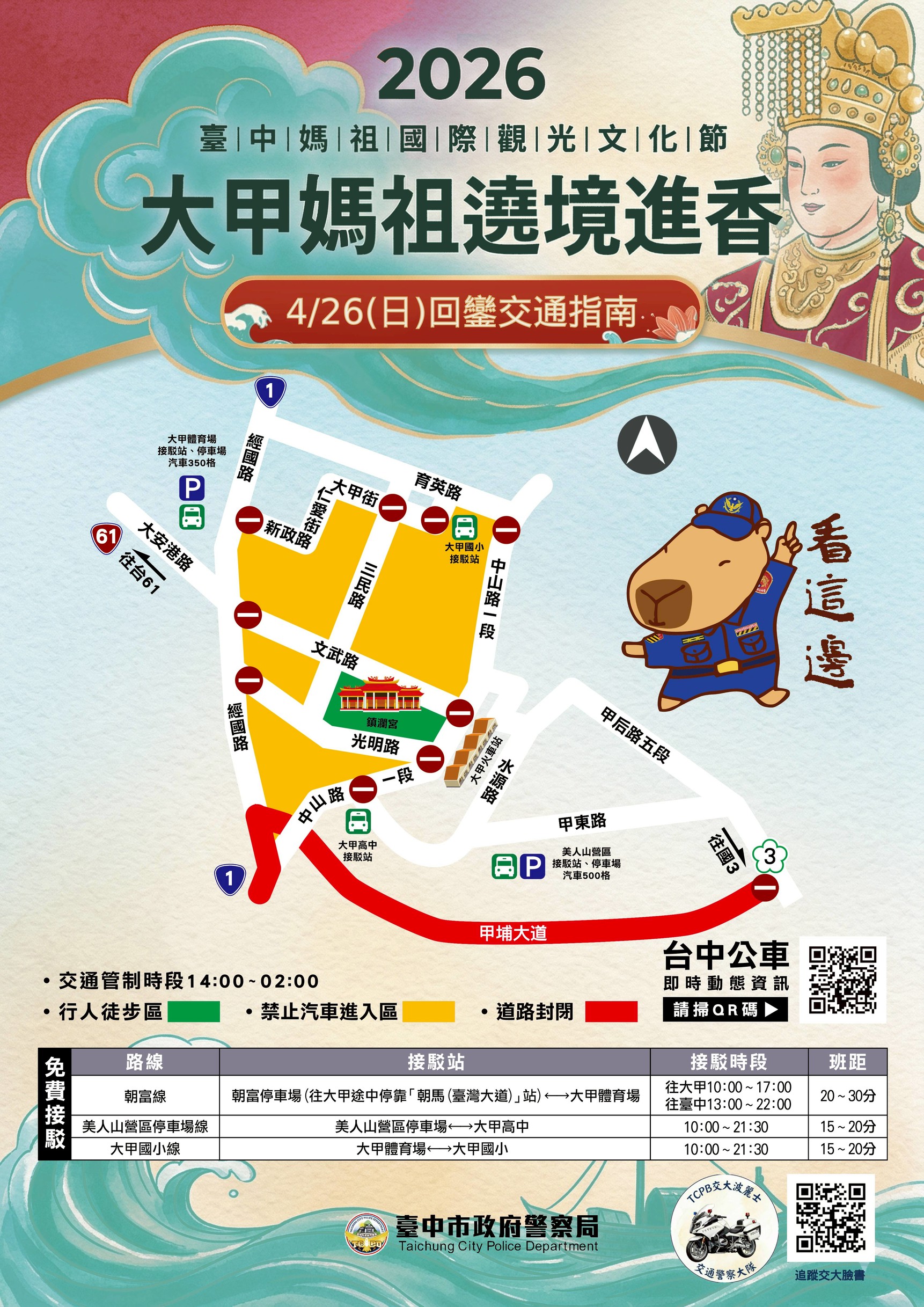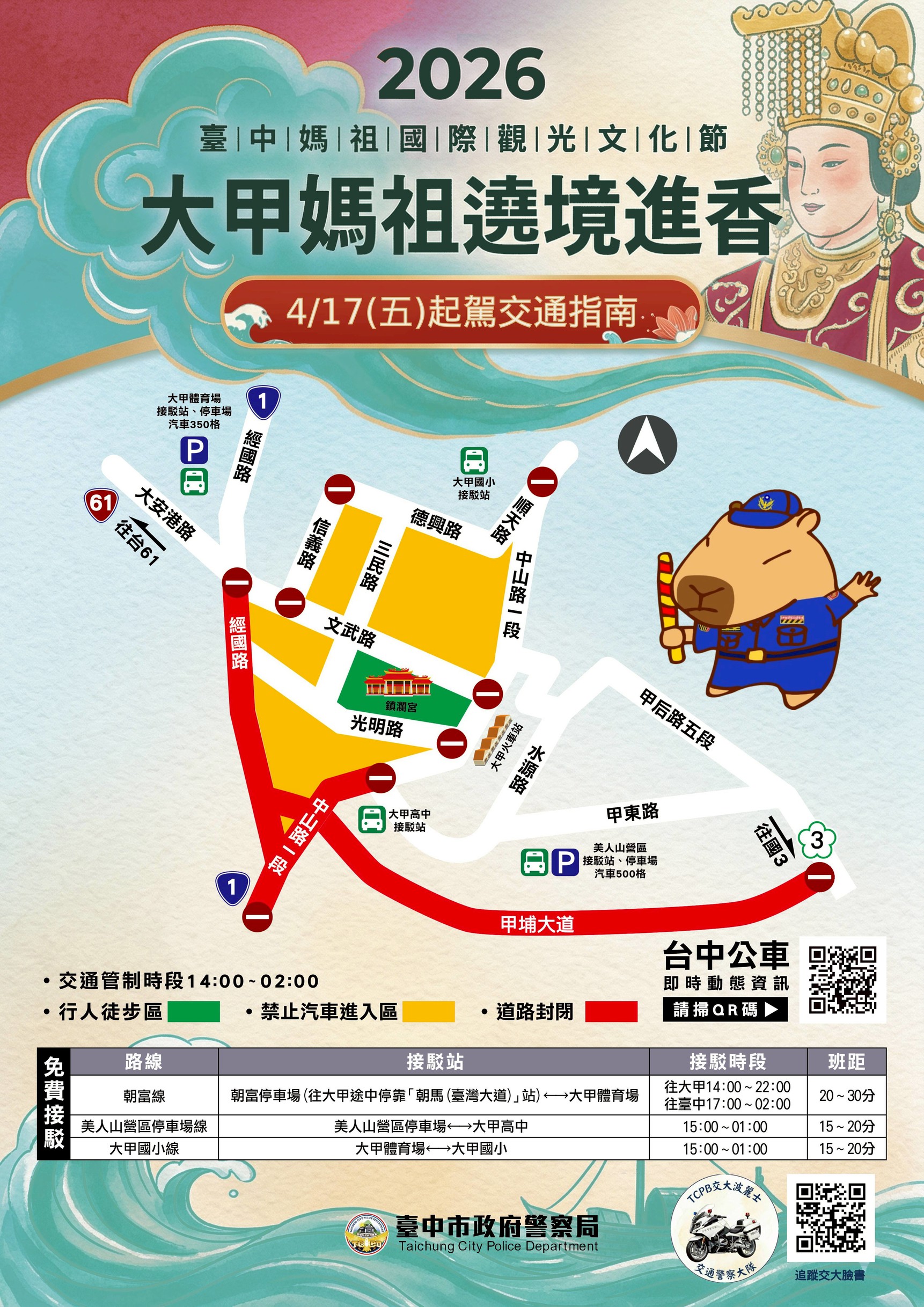 「2026大甲媽祖起駕遶境進香」即將登場,預計吸引超過10萬名信眾參與,臺中市警察局提醒,活動期間人車潮眾多,建議民眾多利用大眾運輸前往。