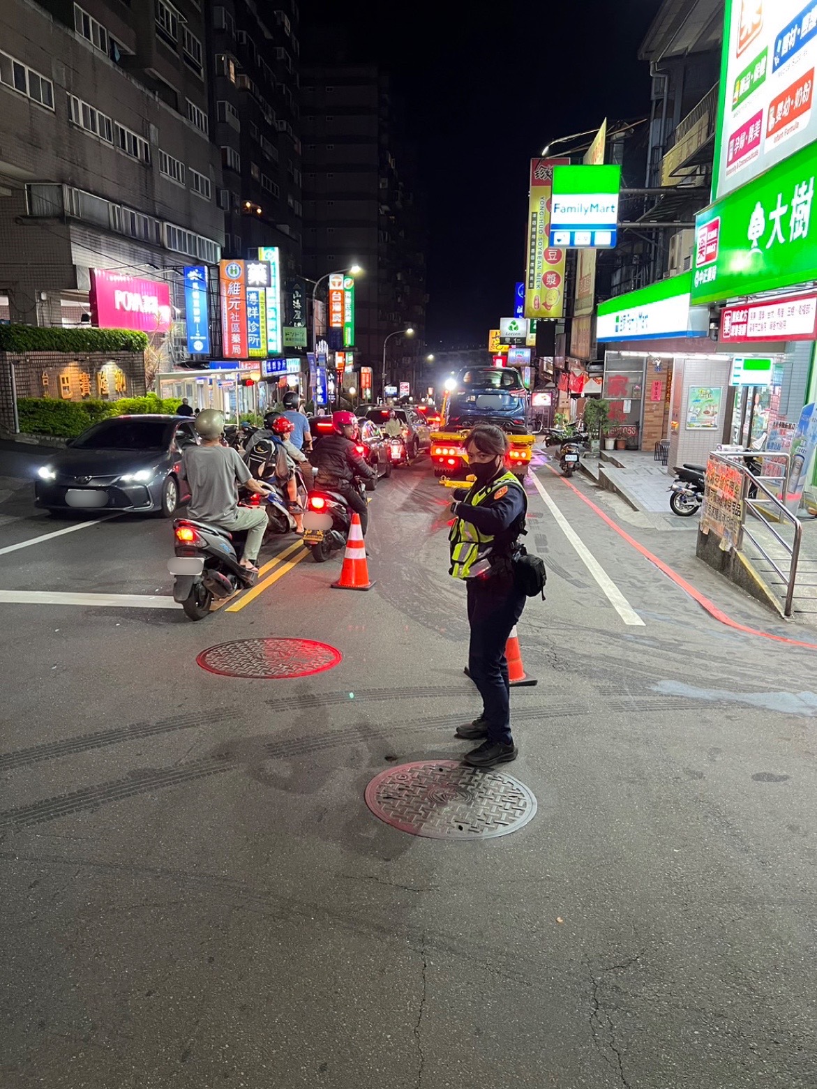 吳姓男子開車經過基隆市新豐街時,車輛突然漏油,路面有大片油漬,警方到場疏導交通,並請環保局人員協助清除油漬,交通才恢復順暢。