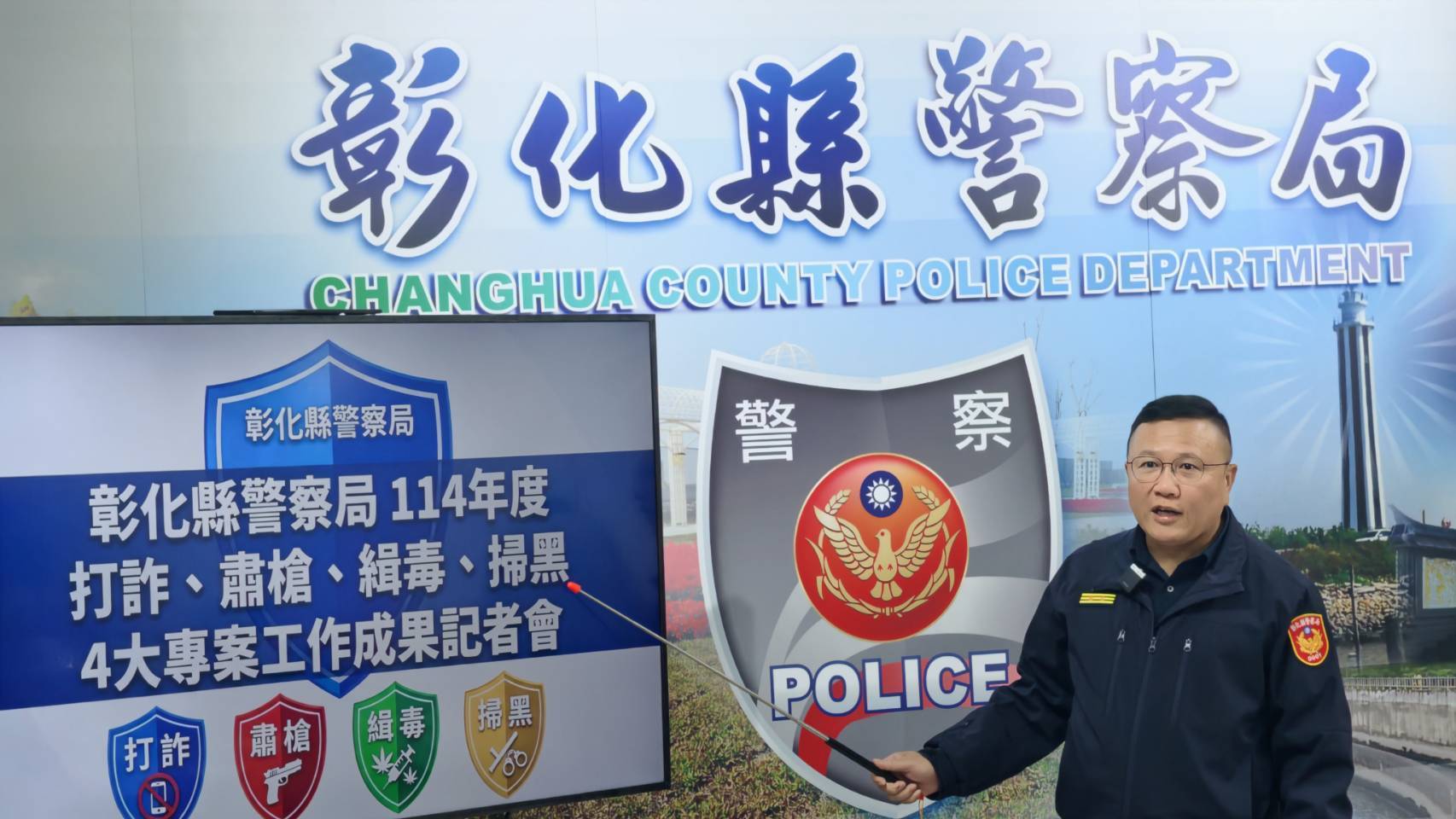 彰化縣警察局陳明君局長透過「打詐儀錶板」數據,說明今年治安交出漂亮成績單,打詐、肅槍、緝毒、掃黑各項查緝成果亮眼。累計查獲詐欺集團340件、犯嫌2,161人次,並查扣汽車、現金、土地、房屋及虛擬貨幣等總計價值7億3,005萬餘元;攔阻詐騙金額達4億8,616萬餘元,累計阻斷詐團金流突破12.1億元;執行掃黑成果,共檢肅治平案件首惡46人,犯嫌人數共297人,查扣沒收不法金流總價值達3,704萬9,500元;查獲毒品案件人數1,820人,其中製造、運輸、販賣供毒網絡254人,查扣毒品咖啡包7,224包、喪屍菸彈1,866顆。查獲非法持有槍械案件24件24人,查扣制式槍枝1枝、非制式槍枝22枝及模擬槍6枝,破獲改造槍械處所3處。