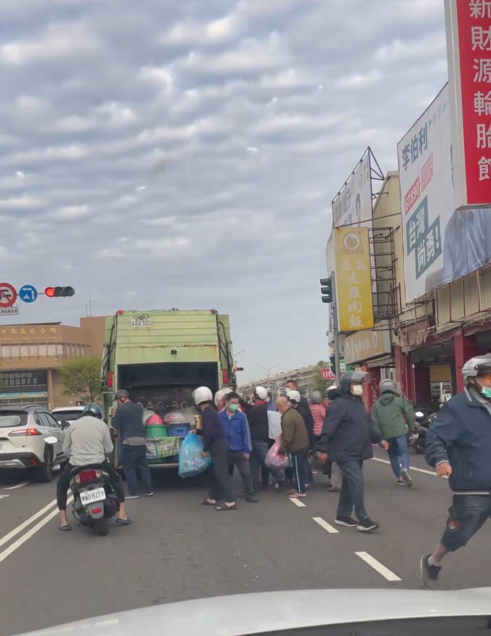 民眾在社群網路上傳影片,一輛在內車道停等紅燈的垃圾車,後方卻出現一群倒垃圾民眾。PO文者表示,這是居民與垃圾車的默契 ,不是定點站,一開始只有三四個人,趁著停紅燈的時候倒。轄區六分局表示,經聯絡清潔隊,影片中的地點並非垃圾車固定停留清運垃圾的地點,而是垃圾車停等紅燈時,民眾利用空檔倒垃圾。分局表示,將加強取締這類違規行為,也請用路人遵守交通規則,注意安全。