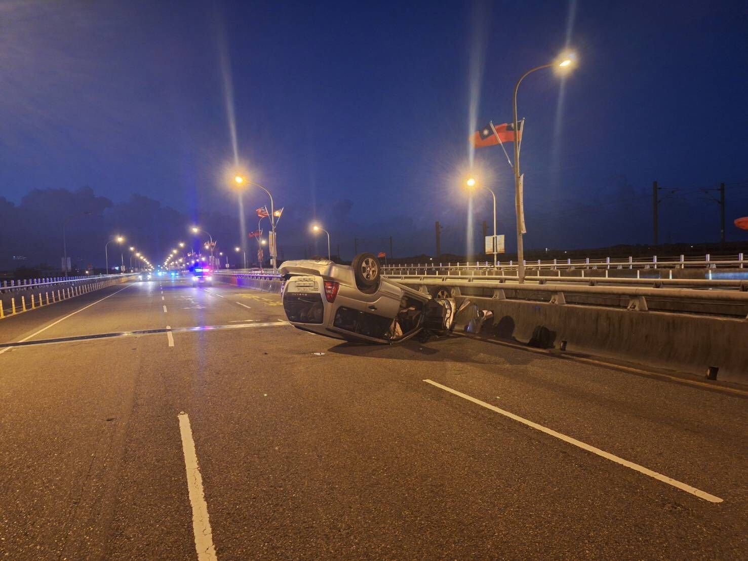 宜蘭縣蘭陽大橋發生機車安全帽掉落路面,旁邊的轎車閃躲,造成另一輛廂型車失控翻覆四輪朝天,非常危險。