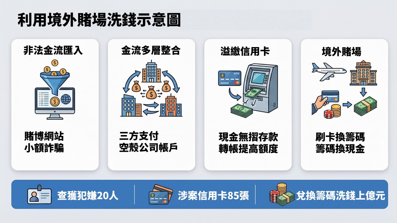 刑事局破獲首例跨境賭場洗錢案,博弈集團在澳門賭場刷卡購買籌碼掩飾金流,完成資金跨境轉移,並藉人頭帳戶信用卡回饋牟利。專案小組逮捕20人,查扣帳戶資金2.3億元及現金外幣等證物,全案依法移送雲林地檢察署偵辦。
