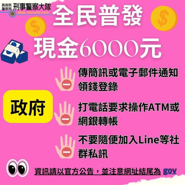 政府普發6000元現金議題,詐騙集團假冒政府機關來引誘民眾受騙上當,嘉義縣警察局局長林宏儒說--政府不會透過簡訊或電子郵件等方式通知民眾領取六千元,也不會電話要求到ATM或網路操作轉帳,沒有識詐觀念,容易遭受詐騙,警方透過多種管道宣導,以提升民眾識詐度與防詐知能,若有任何疑問你可以撥打165反詐騙或110專線查證,讓警察幫助您!多一分警覺,千萬不要讓對方的話影響自己,以免被竊取個資,就可少一分損失!牢記「不點擊、不填輸、不匯款、不轉傳」原則,避免落入詐騙集團的陷阱。