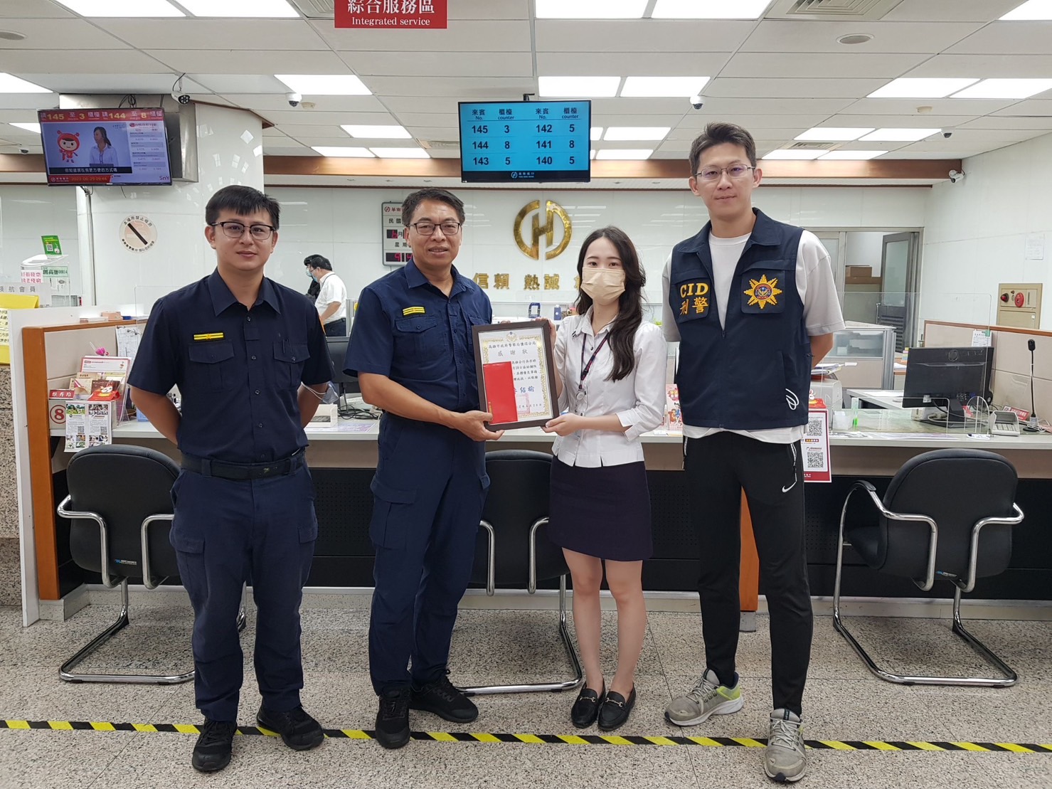 高雄市鹽埕警分局七賢路派出所,接獲轄內銀行報案,有一女子欲匯錢到可疑帳戶疑似遭到詐騙,員警趕赴現場了解,程姓女子透過臉書和youtube發現中國地區生產便宜的玉石心動不已,與網路賣家聯繫,朱家宏所長說,在員警勸說下程姓婦人驚覺被騙,頻頻感謝員警與行員的熱心協助,得以保住積蓄,鹽埕警分局長李紹榆也親自到銀行,表揚機警行員義行,同時呼籲現行詐騙樣態多樣,如有疑問,可以撥打110或165由警方即時協助查證。