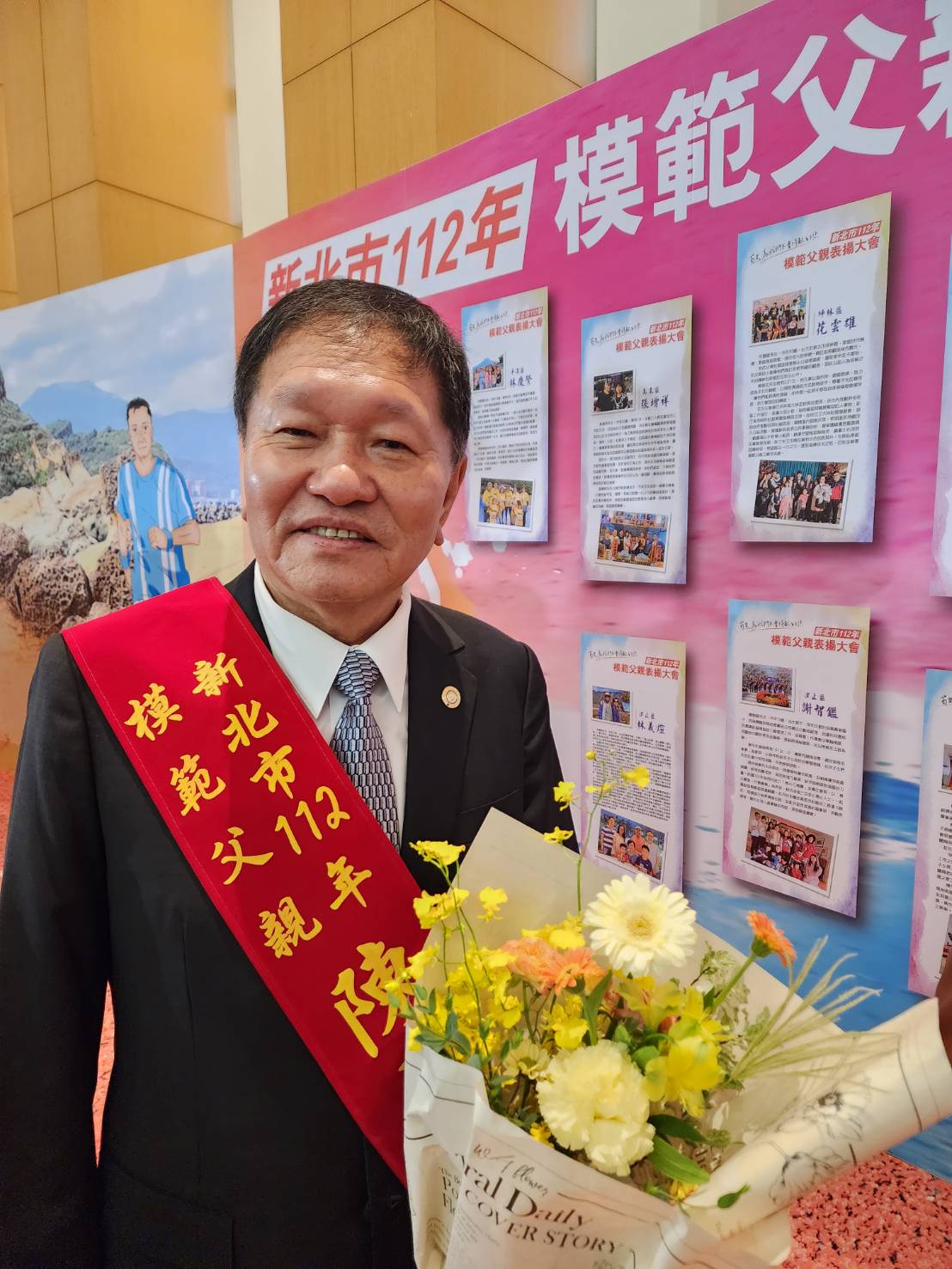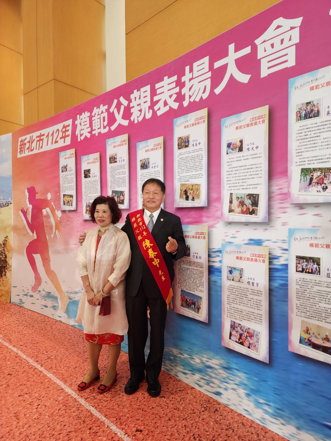 112年新北市模範父親表揚大會由侯友宜市長出席主持,市府官員、各界來賓和親友代表近千人到場觀禮,場面盛大隆重。新北市政府表示,每位獲獎的模範父親都令人尊敬、值得學習,除了對這些走過辛苦歲月、帶領下一代持續向前的父親們致謝,也祝全天下的父親身體健康、平安快樂。本次表揚活動,戶籍在新北市雙溪的本臺警友會主委陳泰中,也獲選新北市模範父親,他在夫人王柔云和親友陪同下出席領獎,回憶近70年人生辛勞奮鬥過程,教養子女甘苦和回饋社會的充實,相當感恩。