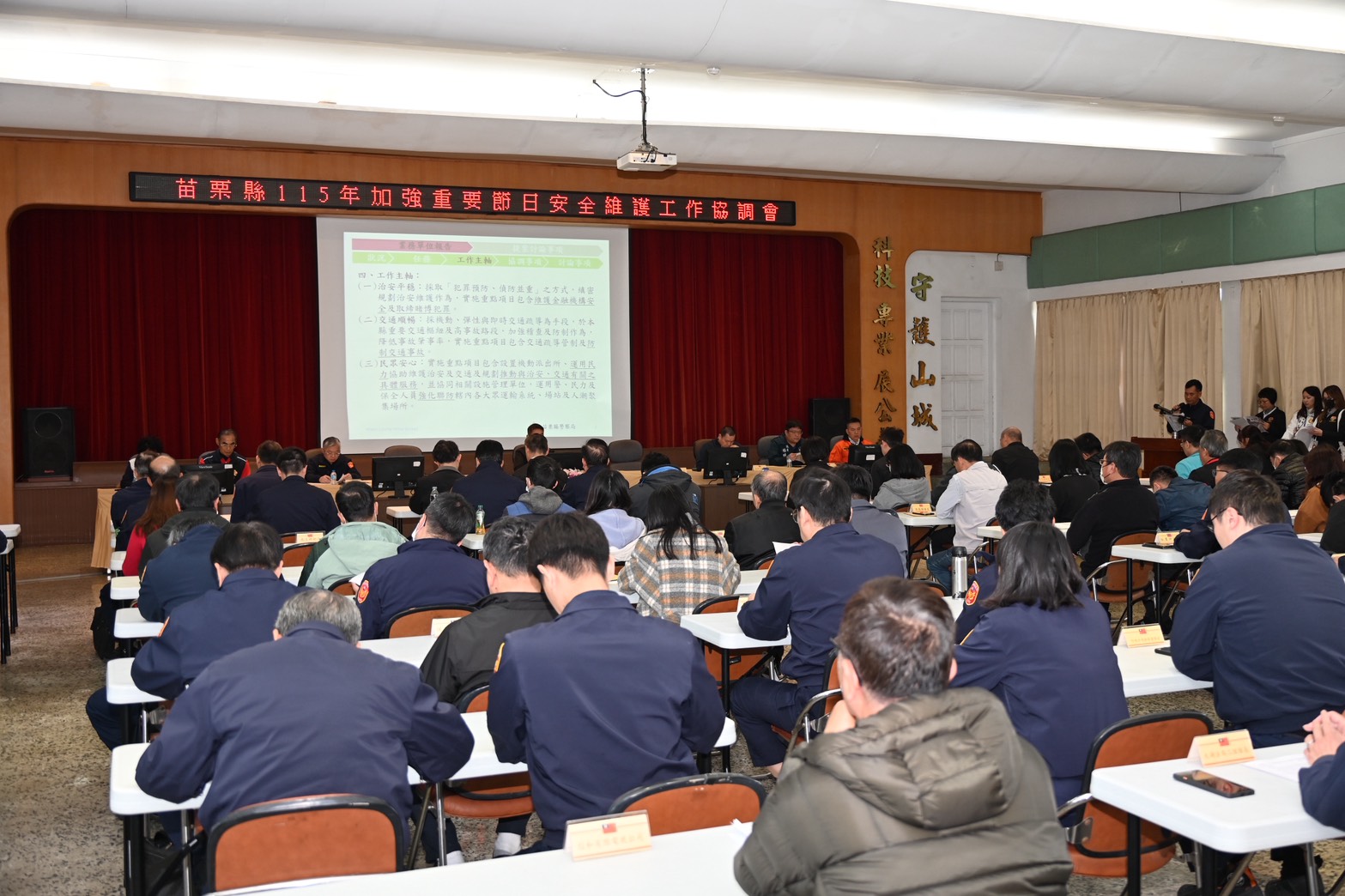 115年加強重要節日安全維護工作自2月9日起展開,為期15天。苗栗縣政府今天(23日)召開協調會,相關單位齊聚交流三大主軸,期盼警民合作,讓民眾在苗栗都能安心過好年。
