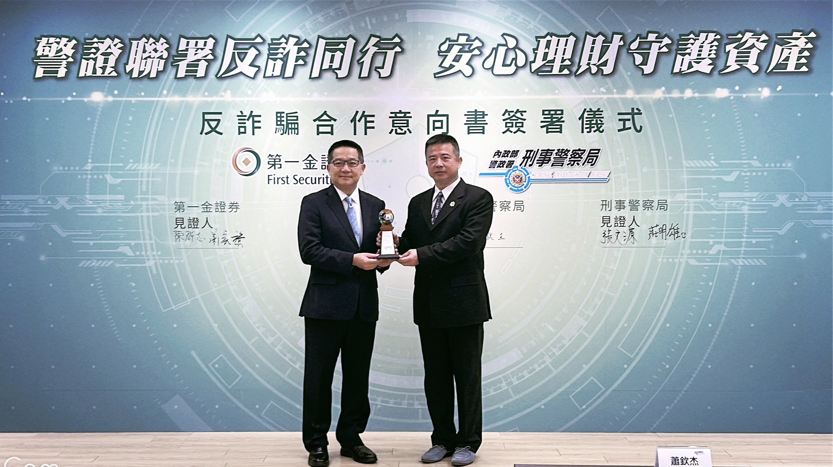 為強化公私協力反詐防線,刑事警察局今天與第一金證券簽署反詐騙合作備忘錄,結合識詐宣導、洗錢防制與科技防詐能量,擴大金融防護網,共同防堵詐欺犯罪。
