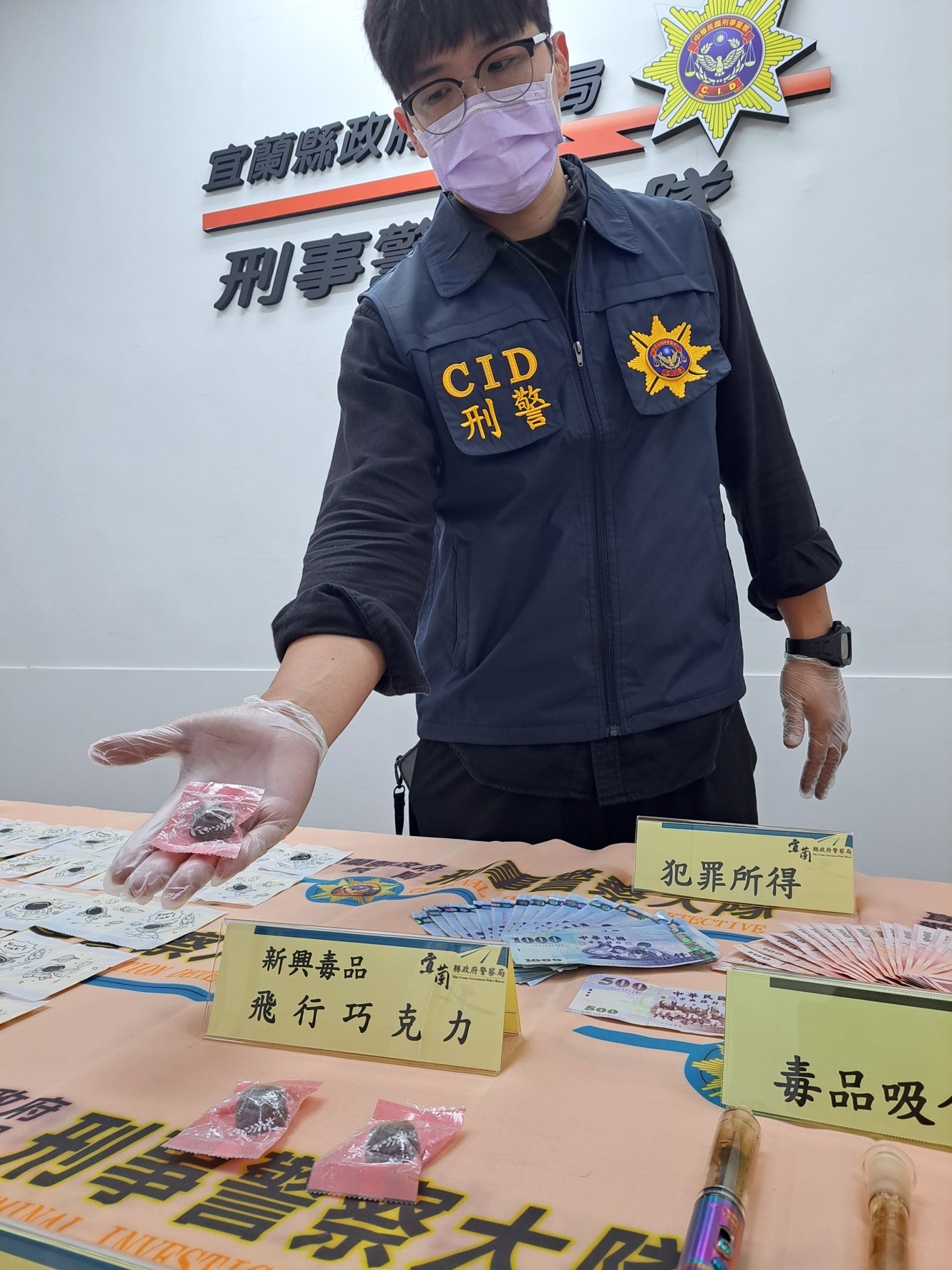 宜蘭縣刑警大隊強力打擊毒品犯罪,針對幫派可疑販毒據點及活動場所,執行全面性威力掃蕩行動,動員32名刑警,兵分5路,查獲173包新興毒品咖啡包及彩虹菸,還在壯圍某KTV據點,查獲毒品通緝犯1名、毒品愷他命及罕見之「飛行者巧克力」,刑警大隊大隊長鄭偉豪說:所謂「飛行者巧克力」就是在巧克力內加入萃取之大麻素,由於是直接食用濃度極高之大麻素,其效果比直接吸食大麻煙更強烈,近期經由外籍人士帶入國內後,目前已在國內大麻圈開始盛行,宜蘭縣警方將深入追緝相關毒品來源及販賣通路,並持續刨根溯源剷除毒害。