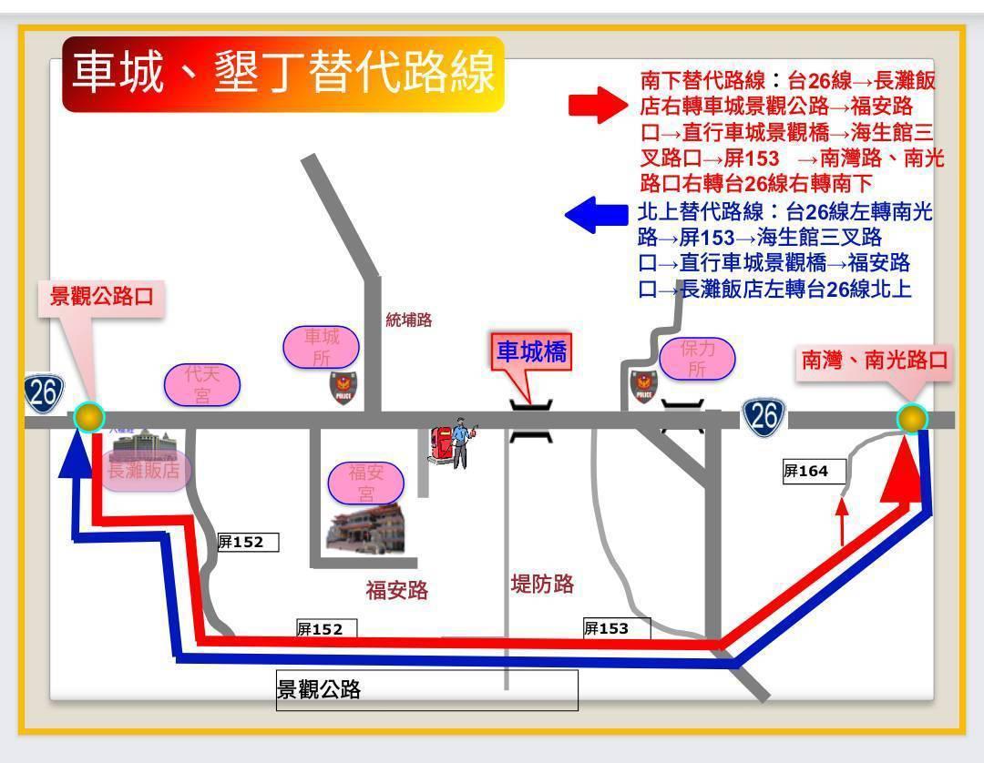 替代道路:台26線主線道路壅塞時,南下遊客車輛可自車城鄉海口長灘飯店路口右轉152線後,接屏153線至南灣南光路口右轉南下;北上返程車輛可由台26線南灣南光路口左轉接屏153線後,至屏152線車城鄉海口長灘飯店路口左轉台26線繼續北上,請民眾多加利用。