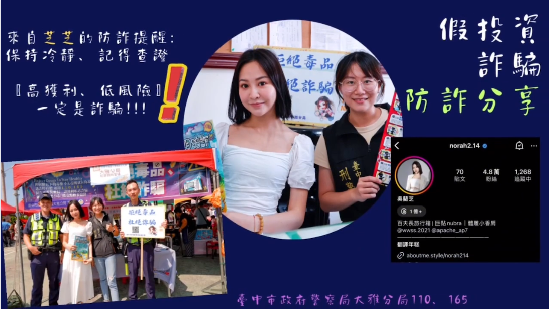 為提升民眾識詐能力,臺中市大雅警分局邀請網紅「芝芝」共同拍攝防詐宣導影片,透過芝芝分享遭假投資詐騙的切身之痛,呼籲民眾切勿聽信高獲利、低風險的話術,才能夠遠離詐騙。