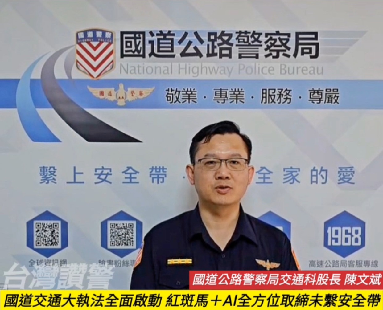 未繫安全帶是造成交通事故重大傷亡主因之一。國道公路警察局交通科股長陳文斌表示,國道警自9月起推動「國道交通大執法」專案,於全國重要路段同步路檢,結合AI科技輔助系統與紅斑馬,形成全方位、無死角執法網,針對未繫安全帶、大型車違規、使用手機與疲勞駕駛等行為加強查緝,在短短兩小時已取締2,158件未繫安全帶違規。