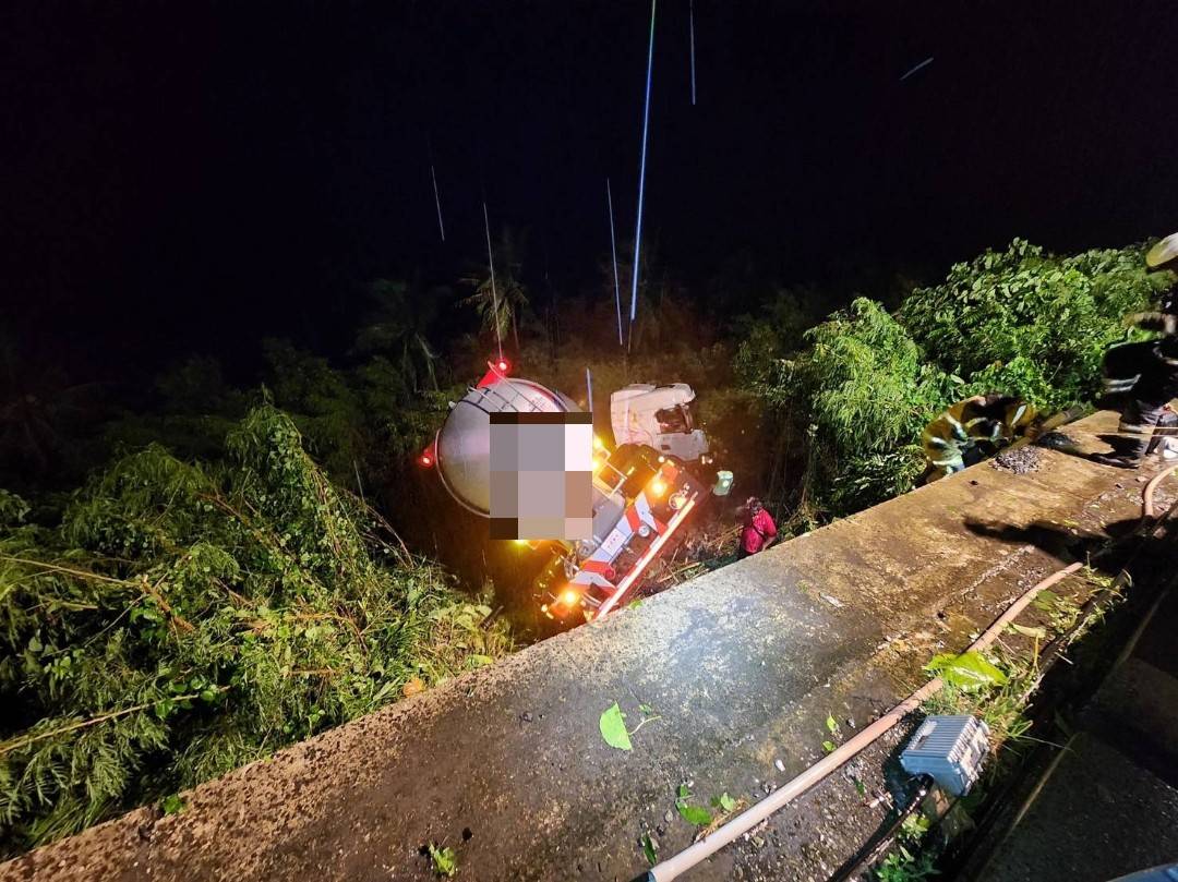 臺9線383.9公里代天宮路段今天(5號)凌晨發生半聯結散裝水泥車自撞護欄翻落邊坡的交通事故,臺東大武警分局員警立即到場交通疏導,並配合消防人員救護傷患,預計上午11點左右可排除事故車拖吊作業,肇事原因大武交通小隊調查處理中。