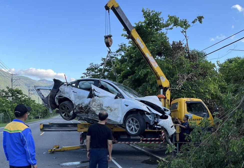 高雄市六龜警方巡邏時,遭一輛特斯拉從右後方高速撞擊,連民宅前的盆栽和路樹都被撞倒,所幸無人傷亡。