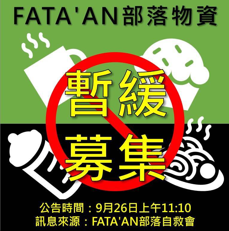 花蓮馬太鞍部落自救會發言人古拉斯‧五木說明,由於許多朋友不斷透過前兩天新聞媒體整理的需求清單送來物資,導致自救會行動據點光復國小,現在被物資堆滿,部落青年疲於整理分類,希望各界能暫停寄送,等待部落粉專「Fata'an 年祭」公布最新資訊。