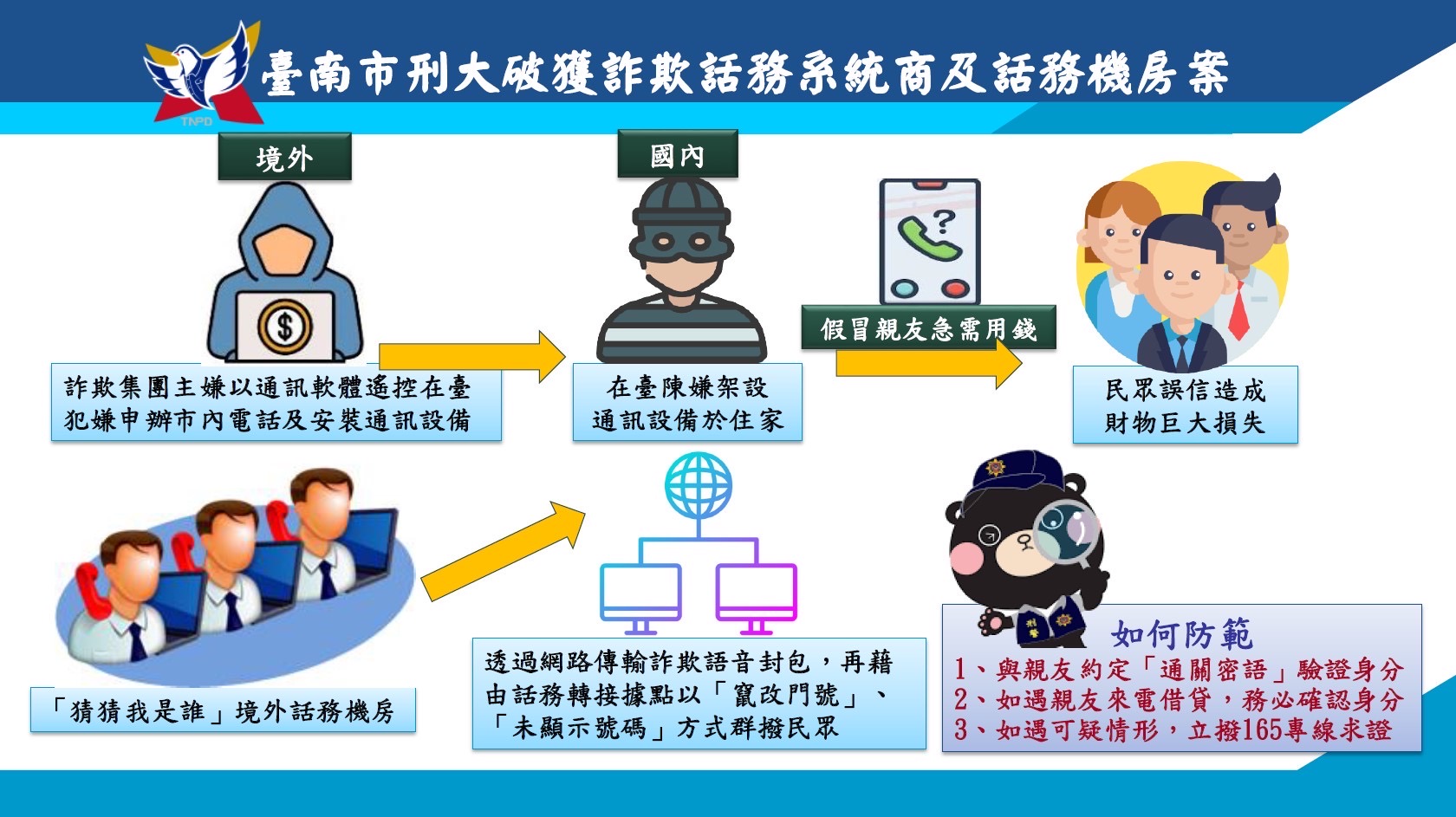 員警上門表明身分,進而逮捕陳姓犯嫌。臺南刑大警方分析民眾遭「猜猜我是誰」類型詐騙案件,發現詐欺集團大量使用「網路電話交換機」,以「竄改門號」、「未顯示號碼」撥出給被害人,假冒被害人親友進行詐騙,循線鎖定陳姓犯嫌。警方也呼籲,民眾與親友可約定特殊「通關密語」作為驗證身分之用,有任何疑問,可撥打165反詐騙諮詢專線尋求協助。