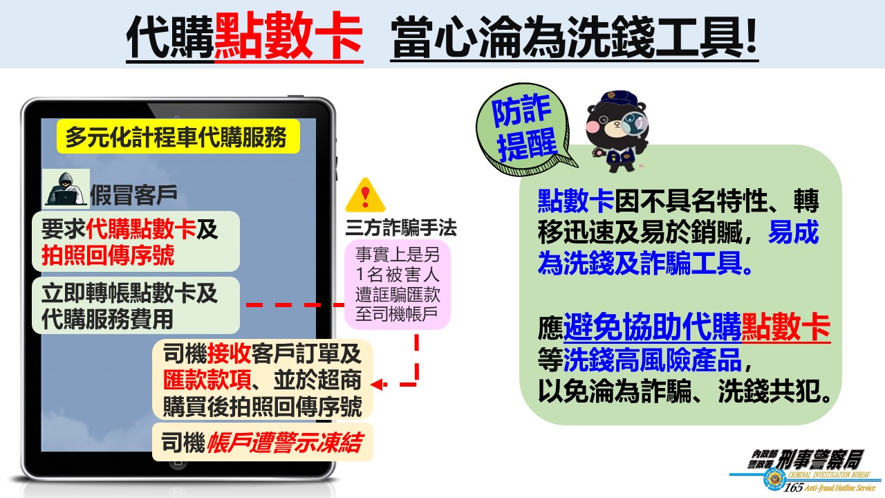 被騙的這名多元計程車司機最近在計程車官方line帳號接到客戶訊息,要求他幫忙到便利商店購買APPLE STORE點數卡以及電信語音儲值卡,並要司機提供帳號將款項先行匯給他,並且會支付幫忙代購的跑腿費用,被害司機不疑有他幫忙購買點數卡和儲值卡,將點數序號拍照傳給對方,後來發現不少同業都接收到相同訂單,而且帳號都因此被通報警示凍結。刑事局表示,這是詐團利用三方詐騙手法洗錢詐財,一方面以詐術誆騙被害人將錢匯入不知情被害司機的帳戶,另一方面從司機幫忙代購取得點數序號,隨後到網路平台低價銷售銷贓,如此被詐被害人損失了金錢,代購的司機則成了洗錢人頭帳戶。刑事局提醒,點數卡有不記名、轉移快容易銷贓的特性,因此常成為詐團洗錢詐騙工具,民眾最好避免代購點數卡等容易被利用為洗錢的高風險產品,以免落入詐欺洗錢共犯的窘境。