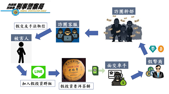 刑事局南部打擊犯罪中心偵辦詐欺案,發現林姓男子為詐欺集團首腦,指揮成員透過社群軟體加入不特定被害人,先以噓寒問暖的假交友方式取信他們,然後就是一連串的養套殺,刑事局偵八大隊第二隊鄭世興隊長說,復以投資高獲利等話術,邀請被害人加入社群軟體群組,併傳送假投資標的「老班章普洱茶」供被害人買賣投資,待被害人陷入錯誤後,集團即指派車手向被害人收取款項,車手收取贓款即依集團指示交付予偽冒之虛擬貨幣幣商(假幣商),待被害人要求購回普洱茶餅,卻無法取回款項,始驚覺遭詐。