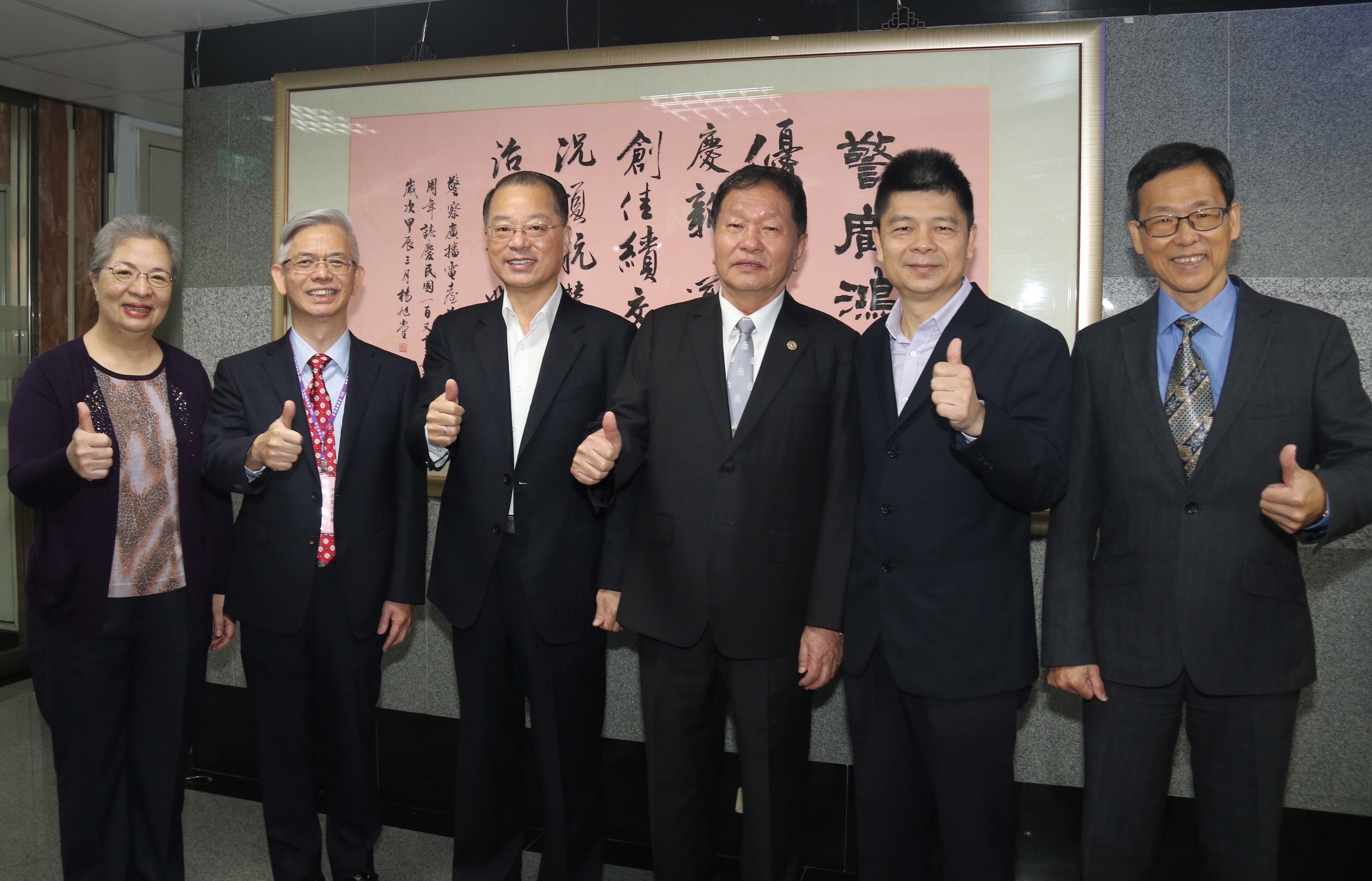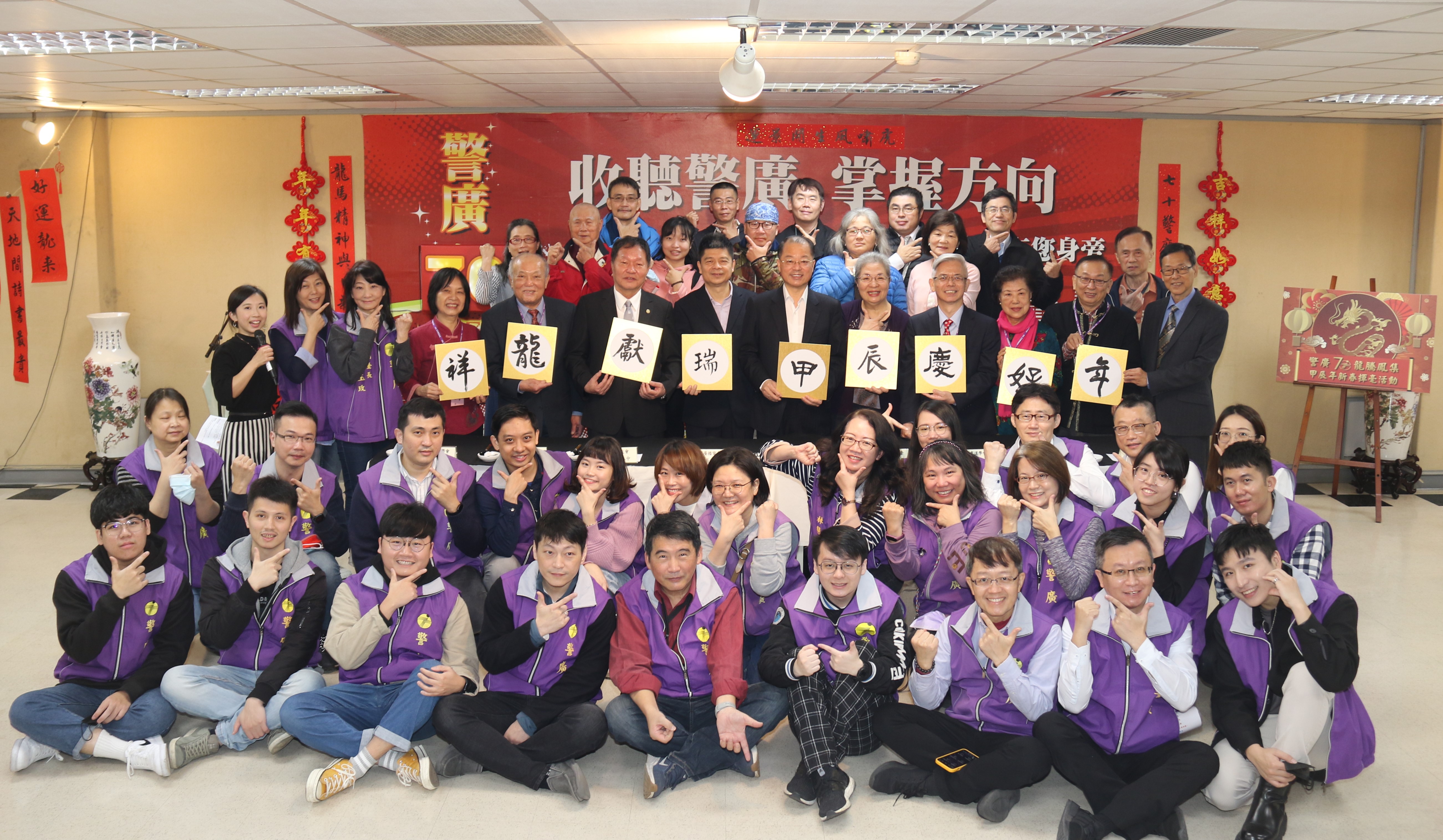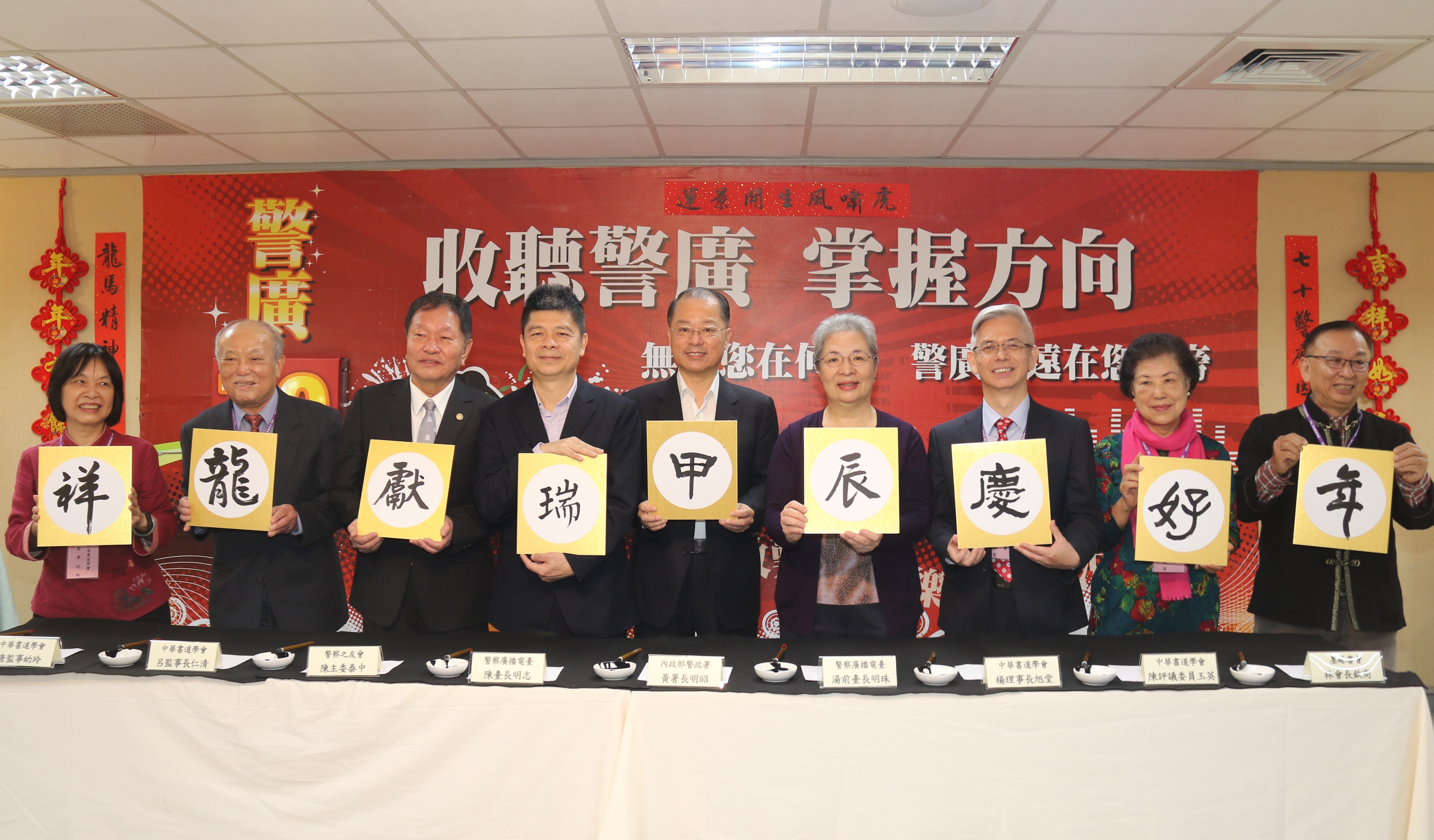 警察廣播電臺歡慶70歲生日,邀請中華書道學會楊旭堂理事長創作「警廣鴻慶」書藝作品,今天舉行揭牌儀式以及新春揮毫活動,警政署長黃明昭、警友會陳泰中主委等人都到場參與,共同祝賀警廣生日快樂。