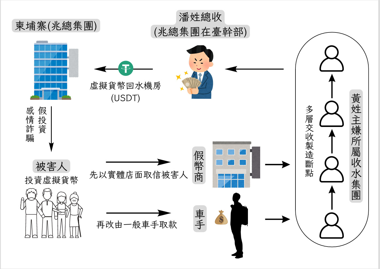 偵查第九大隊副大隊長李奇勳表示,該詐團與柬埔寨「兆總集團」合作,透過幫眾將贓款多層交收,再購買虛擬幣製造金流斷點,以隱匿不法所得。