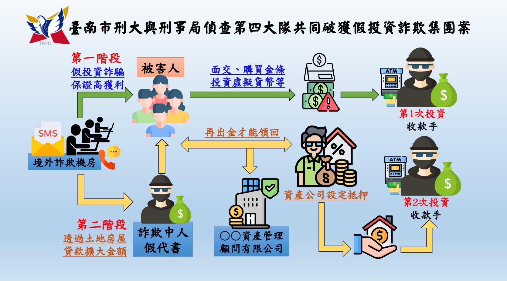 臺南市政府警局刑事警察大隊破獲資產管理公司配合假投資詐欺集團,辦理房貸詐騙被害人,受害者遍及全臺,初估遭詐金額高達二億多元;警方帶回蘇姓犯嫌等廿人到案。